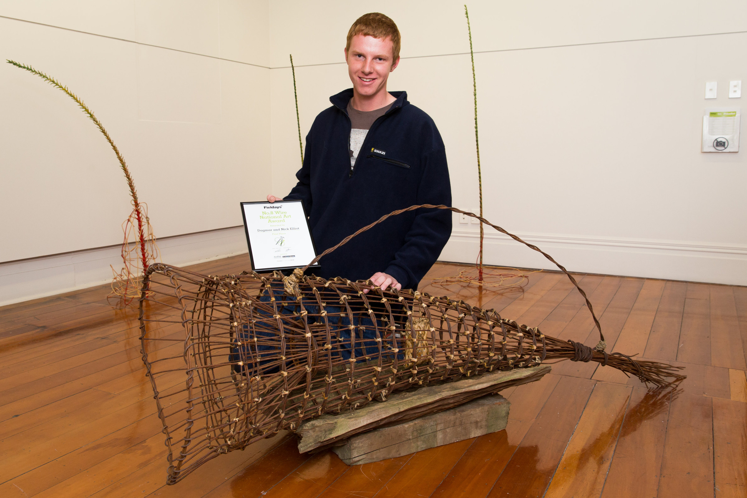 A hinaki made of rusty No.8 wire and flax has won the major prize in the 2014 Fieldays No.8 Wire National Art Award. Artists Dagmar and Nick Elliott took out the $8,000 prize for their entry Rustic Hinaki at the awards ceremony sponsored by Fieldays and held at ArtsPost last night.
